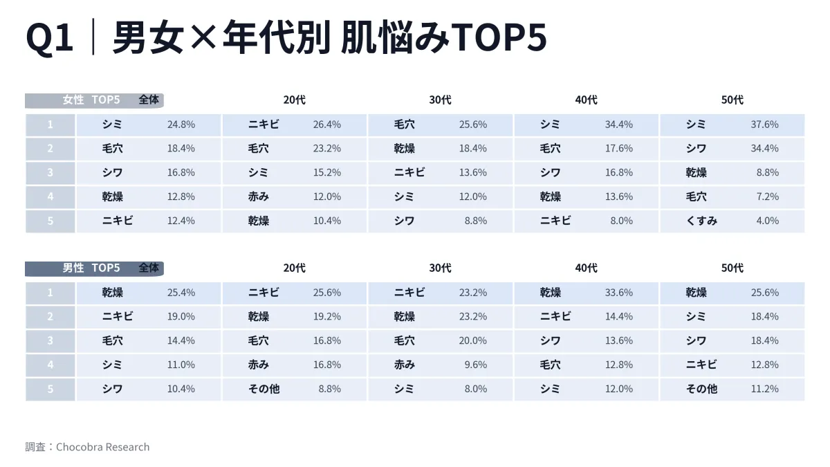 これらの結果から、肌悩みの内容は性別によって異なるだけでなく、年代にも大きく影響されることが分かります。特に、20代では「ニキビ」、30代では「毛穴」、40代以降になると「シミ・そばかす」の悩みが増える傾向が顕著です。