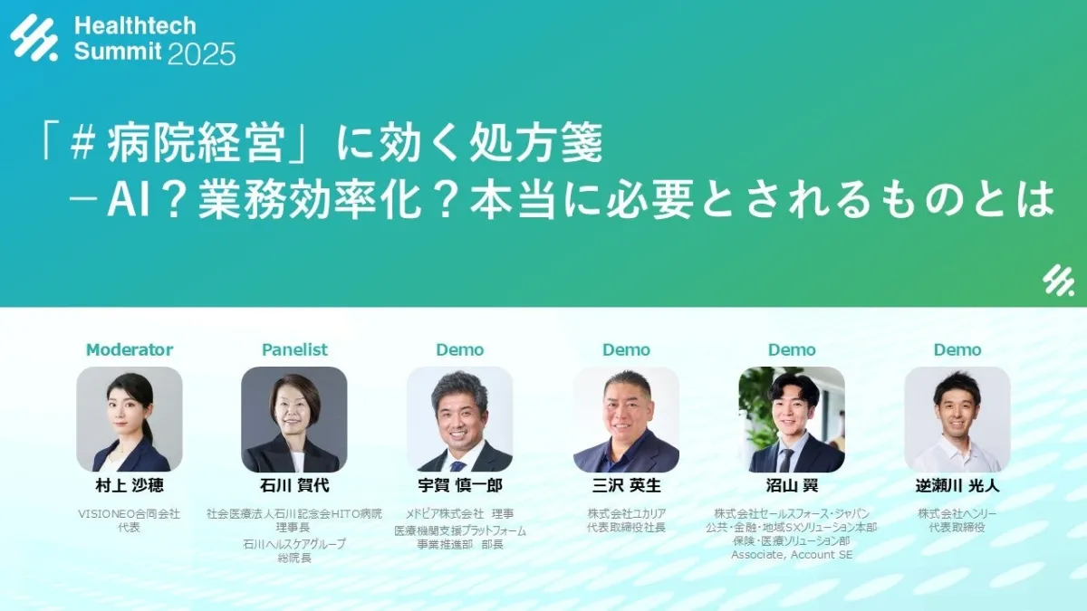 話題は、AIやタスクシフトなどの選択肢に関して、実際に経営に資する「処方箋」を見つけ出すこと。モデレーターに村上沙穂氏(VISIONEO合同会社社長)が参加し、パネリストには石川賀代氏(社会医療法人石川記念会HITO病院理事長)、沼山翼氏(株式会社セールスフォース・ジャパン)、宇賀慎一郎氏(メドピア株式会社)などの名立たるメンバーが揃います。