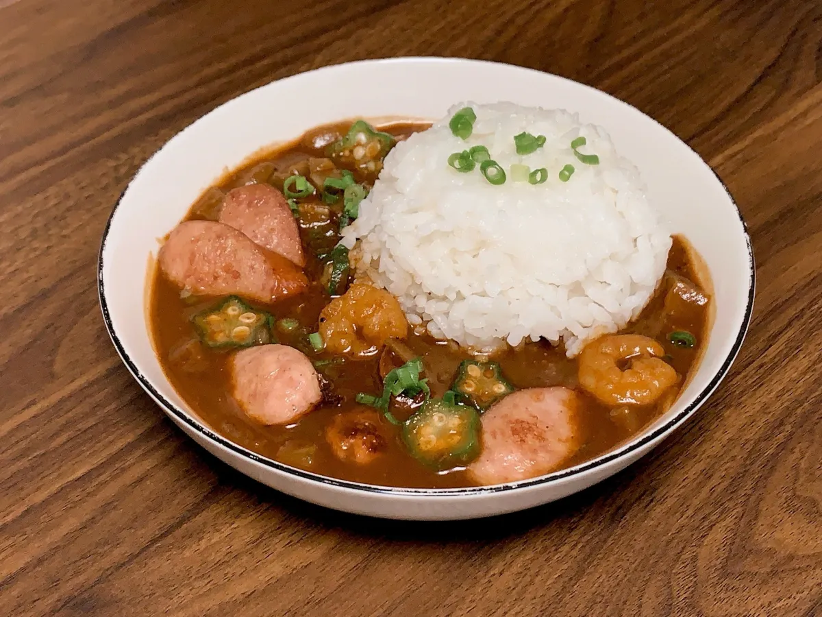 このガンボは、ケイジャンスパイスが香るオクラ入りのスープであり、ごはんにかけても、煮込んで食べても楽しめる料理です。そしてこの料理が、粘りが少なくスープになじみやすいカルローズ米によって、更にその魅力を引き立てます。カルローズは、カリフォルニア生まれの中粒種のお米であり、軽い食感が特長です。
