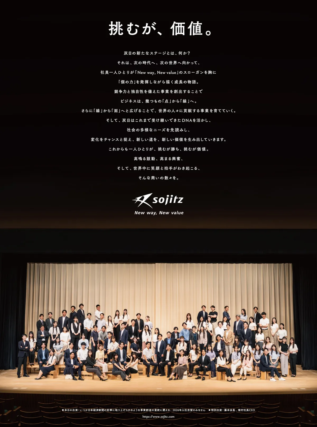 広告のタイトルでもある「挑むが、価値。」は、双日が受け継いできた企業文化の核心を表しています。挑戦そのものに価値があり、挑み続けることで成長や新たな価値を生み出すというメッセージが込められています。多様な人材が集まる中で、個々の挑戦と成長を促進し、結果的には組織全体の成長へとつなげることを目指しています。