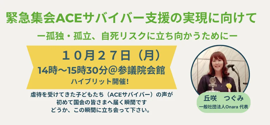 子ども時代の虐待がもたらす影響は、見えないまま大人になっても続くことが多く、ACE(Adverse Childhood Experience:逆境的小児期体験)として知られるこの現象が、心身に与えるダメージは計り知れません。一般社団法人Onara代表理事の丘咲つぐみ氏は、こうした現状を広く知ってもらうための院内集会を開催します。