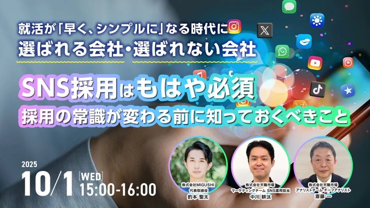 採用市場の変化に対応し、選ばれる企業になるためのウェビナーが開催されます。株式会社天職市場が手掛けるこのオンラインセミナーは、2025年10月1日(水)15:00から行われます。セミナータイトルは「SNS採用はもはや必須 ― 採用の常識が変わる前に知っておくべきこと就活が「早く、シンプルに」なる時代に選ばれる会社・選ばれない会社」です。