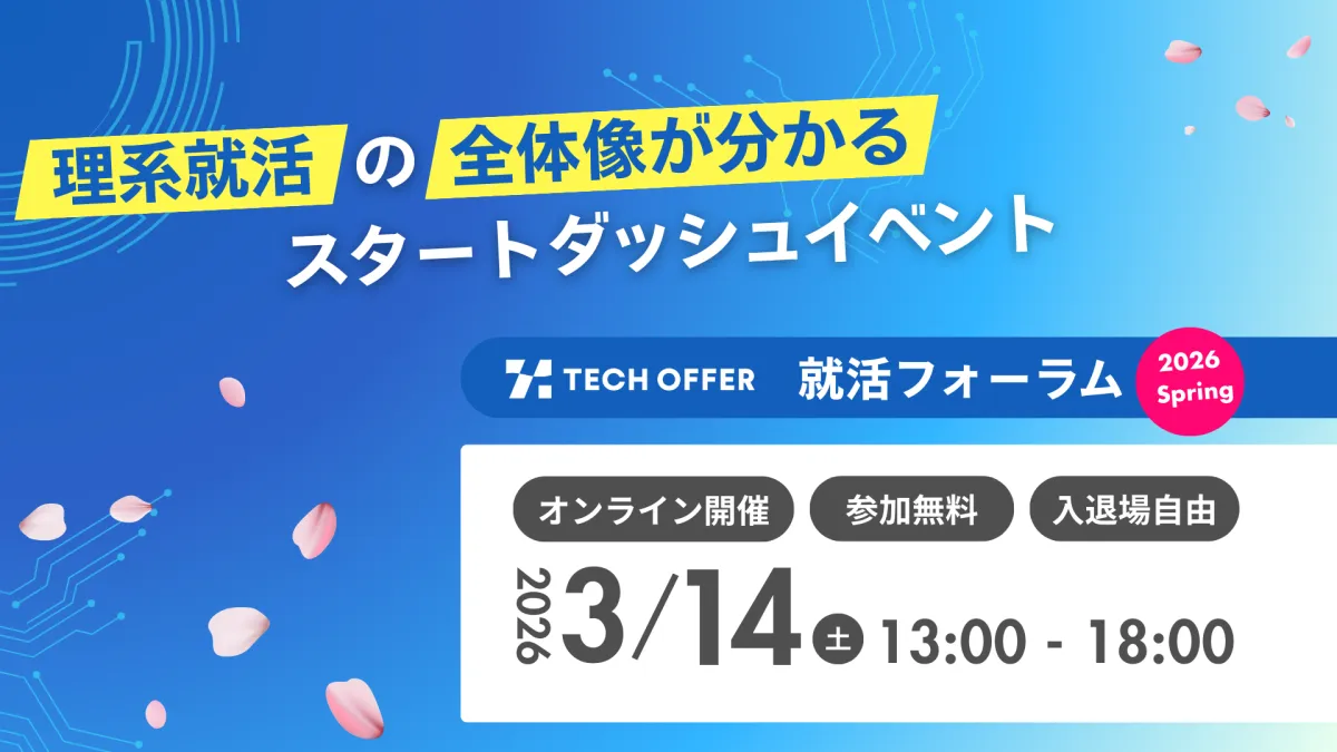 この春、新たなキャリアの一歩を踏み出すために是非「TECH OFFER 就活フォーラム2026 Spring」に参加してみてはいかがでしょうか。未来の自分を見つけるチャンスが待っています!