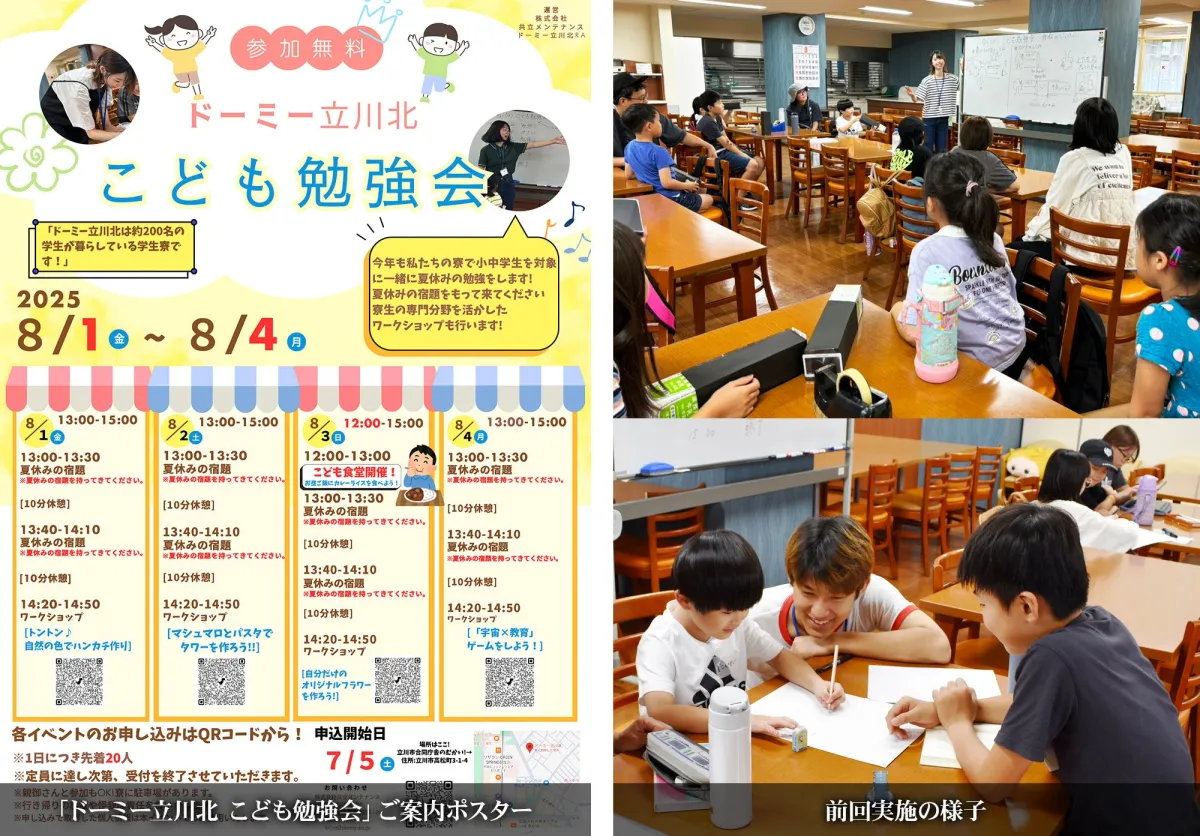 学生寮「ドーミー立川北」が、地域の子どもたちを対象にした「第3回こども勉強会」を2025年8月1日(金)から8月4日(月)の間に実施します。この取り組みは、株式会社共立メンテナンスが運営するもので、寮生たちが主体となって企画・運営にあたるのが特徴です。