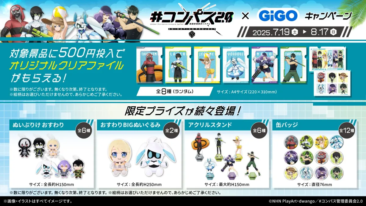 2025年7月19日(土)から2025年8月17日(日)まで、株式会社GENDA GiGO Entertainmentが主催する「TVアニメ『#コンパス2.0 戦闘摂理解析システム』 × GiGOキャンペーン」が全国のGiGOグループ店舗で実施されます。このキャンペーンでは、アニメのために新たに描かれたイラストを用いた特別なクレーンゲーム用景品や、コラボたい焼き、ノベルティ付きドリンクなど、多彩な企画が楽しめます。
