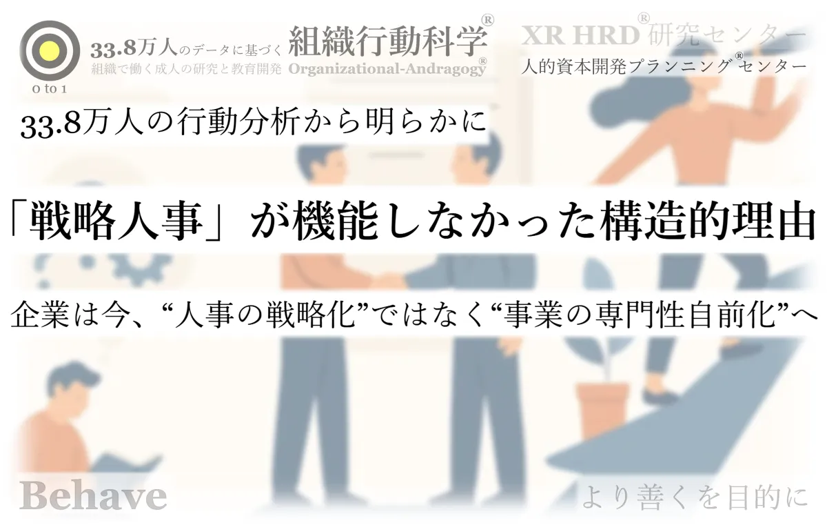 本レポートは、その原因を明確にしています。それは「人事部門が事業固有の専門職能を担うことができない」という構造的な限界です。現在、「人事の戦略化」を強調するのではなく、企業自らが専門職能を備え、現場での実体験を通じてそれを育てる新しい価値創造の仕組みの再構築が求められています。