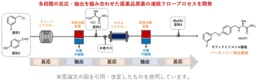 新たに開発された連続フロー合成技術では、各反応段階において使用する溶媒が統一され、中間体の単離や精製工程を省略することにより、迅速かつ高効率でサフィナミドメシル酸塩を生産できます。具体的には、基本的な3つの反応を連続して行うことで、従来のバッチ法と比べて反応効率は3.4倍、廃棄物の発生量は20%も削減されます。