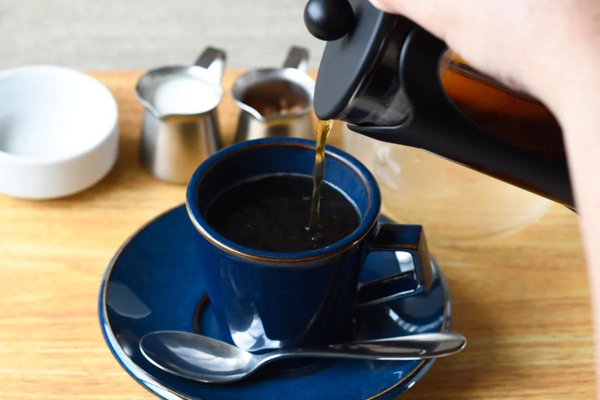フレンチプレスで抽出したコーヒーはコーヒー豆の個性をダイレクトに感じられ、まろやかで香り豊かな味わいが楽しめます。1回の提供で約2杯分のボリュームがあるため、ブラックで飲むもよし、コーヒーオイルとの相性が良いミルクを加えてもコク深い味わいが堪能できます。