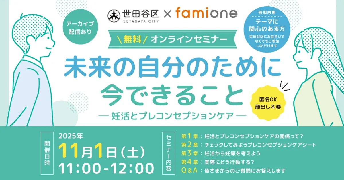 世田谷区と株式会社ファミワンは、幸福な人生を歩むために、これから妊娠を考えている方の支援に力を入れています。興味のある方はぜひお気軽にご参加ください。