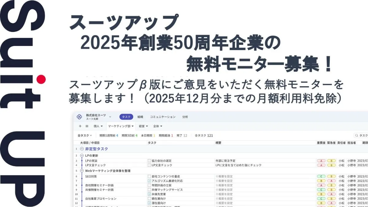 株式会社スーツが手掛ける、チームで使えるタスク管理・プロジェクト管理ツール「スーツアップ」が、2025年に創業50周年を迎える企業に向けて無料モニターの参加者を募集します。この特別な機会に、スーツアップの使いやすさを体験してみませんか?