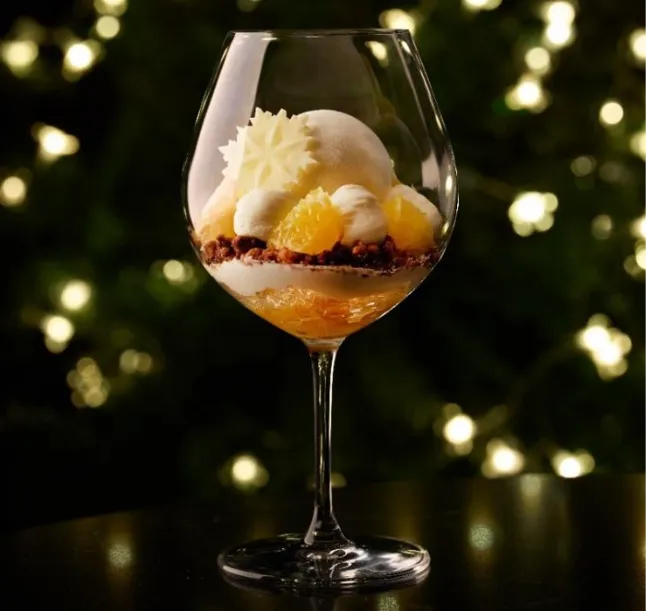 このパフェは、ウィンターシーズンの美しい雪景色を反映したビジュアルが魅力です。ホワイトチョコレートで作られた雪の結晶がデザートの上に飾られており、季節の雰囲気を楽しむことができます。デザートの中心には、バニラアイスとともに提供されるクリームチーズやフロマージュブランのミルキーな味わいが広がり、きよみオレンジのジューシーな香りが口いっぱいに広がります。