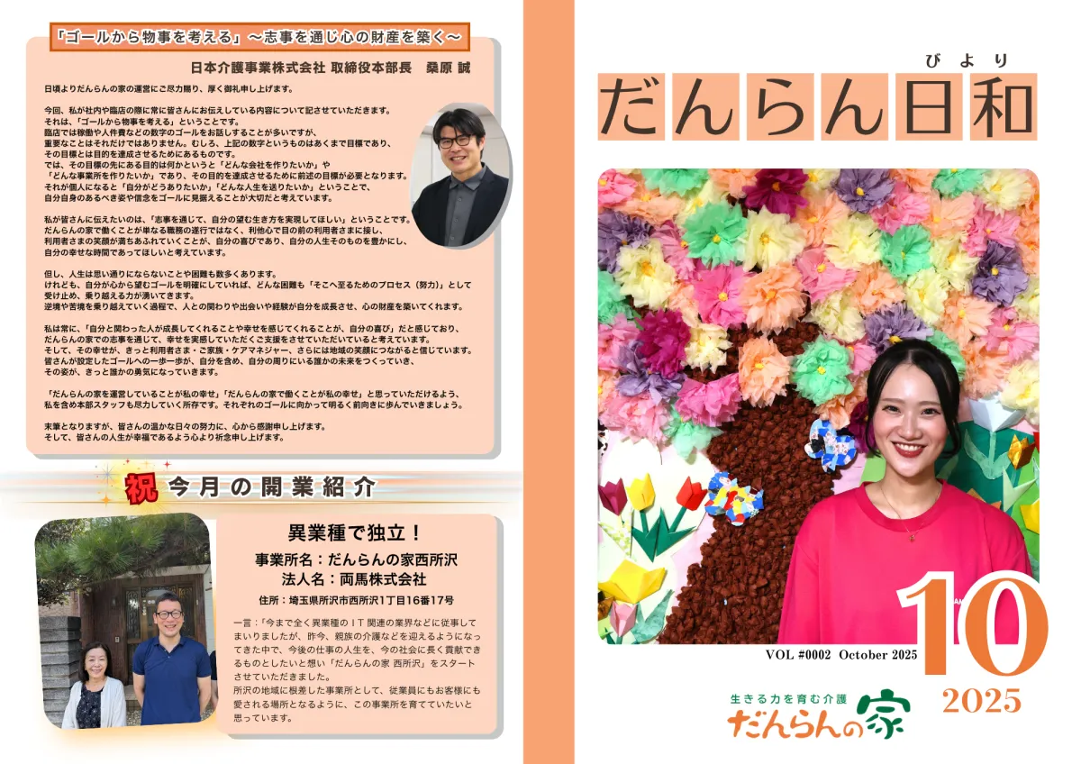 利用者の笑顔あふれる日々の様子、新たに開業した『だんらんの家 西所沢』の情報もあり、読者にとって有益な内容が満載です。さらに本部が主催した『生活相談員研修』の記事もあり、介護を提供するスタッフのさらなるスキル向上に対する取り組みが紹介されています。