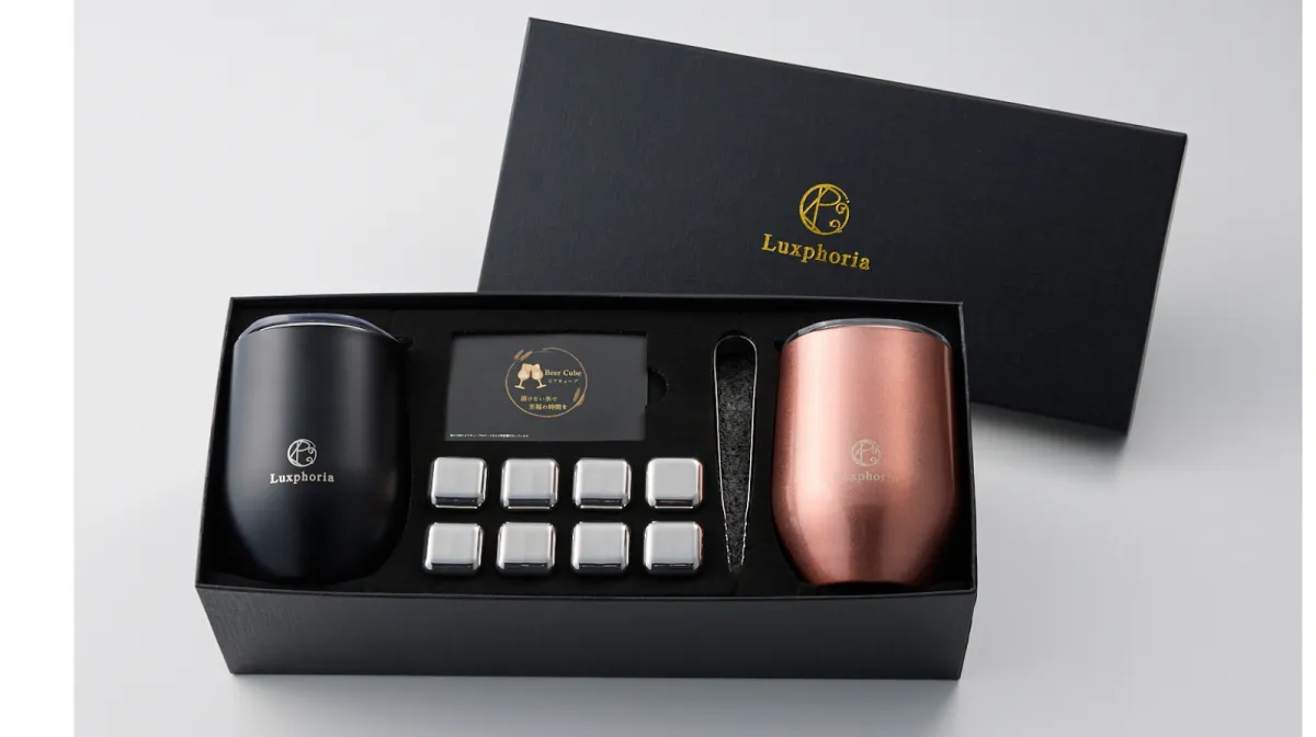 このビアキューブペアギフトセットには、高品質な生活雑貨ブランド「Luxphoria」のロゴ入りタンブラーが含まれています。内容は以下の通りです:
