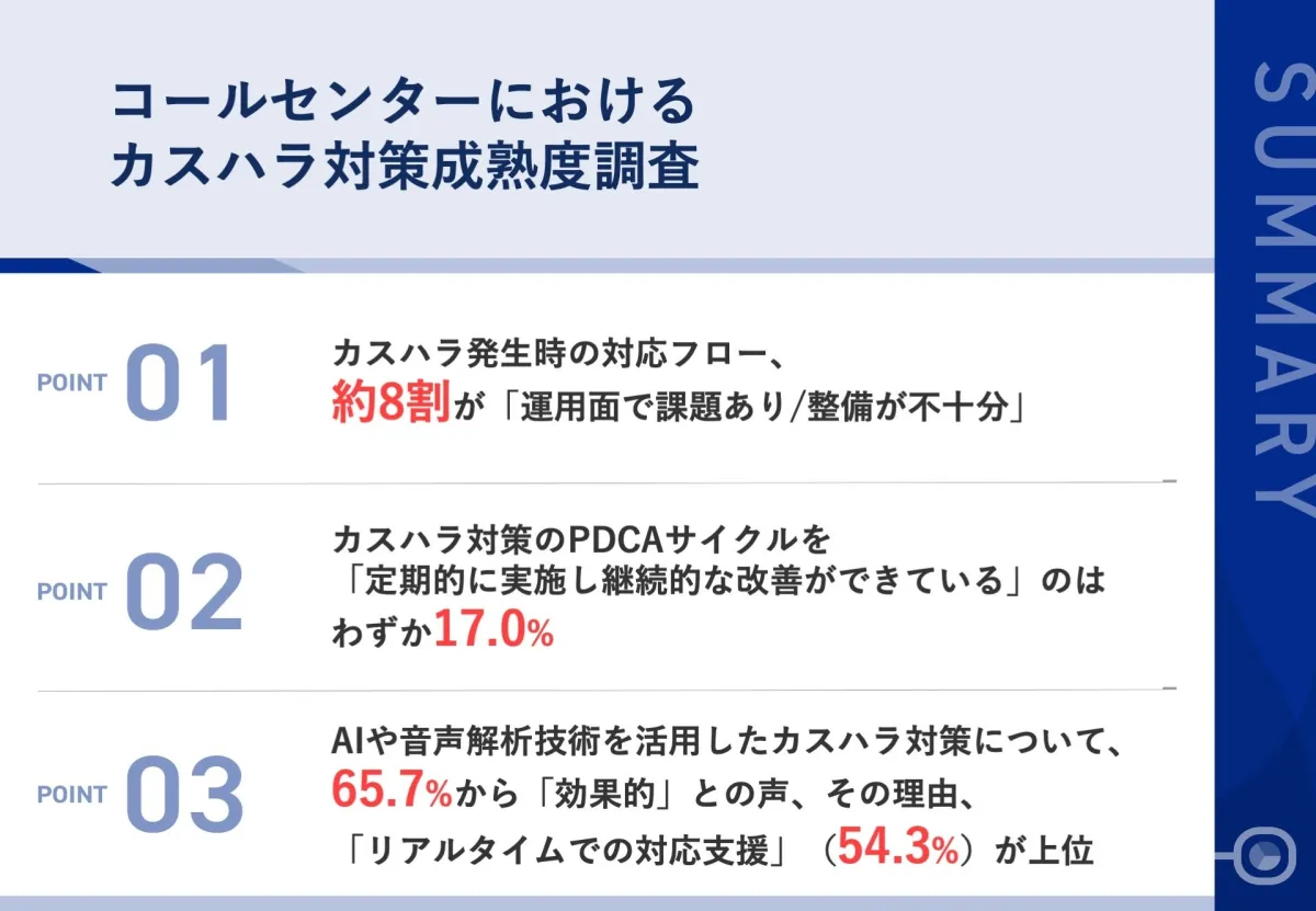 今回の調査結果から見えてきたのは、コールセンターでのカスハラ対策が未熟であるという痛切な現実でした。対応フローやPDCAサイクルが整備されていないことで、オペレーターの負担が増し、顧客対応にも影響が出ていると考えられます。AI技術は、今後のカスハラ対策において重要な役割を果たすでしょう。すべての関係者がこの調査を活用し、改善に向けた一歩を踏み出すことが期待されます。