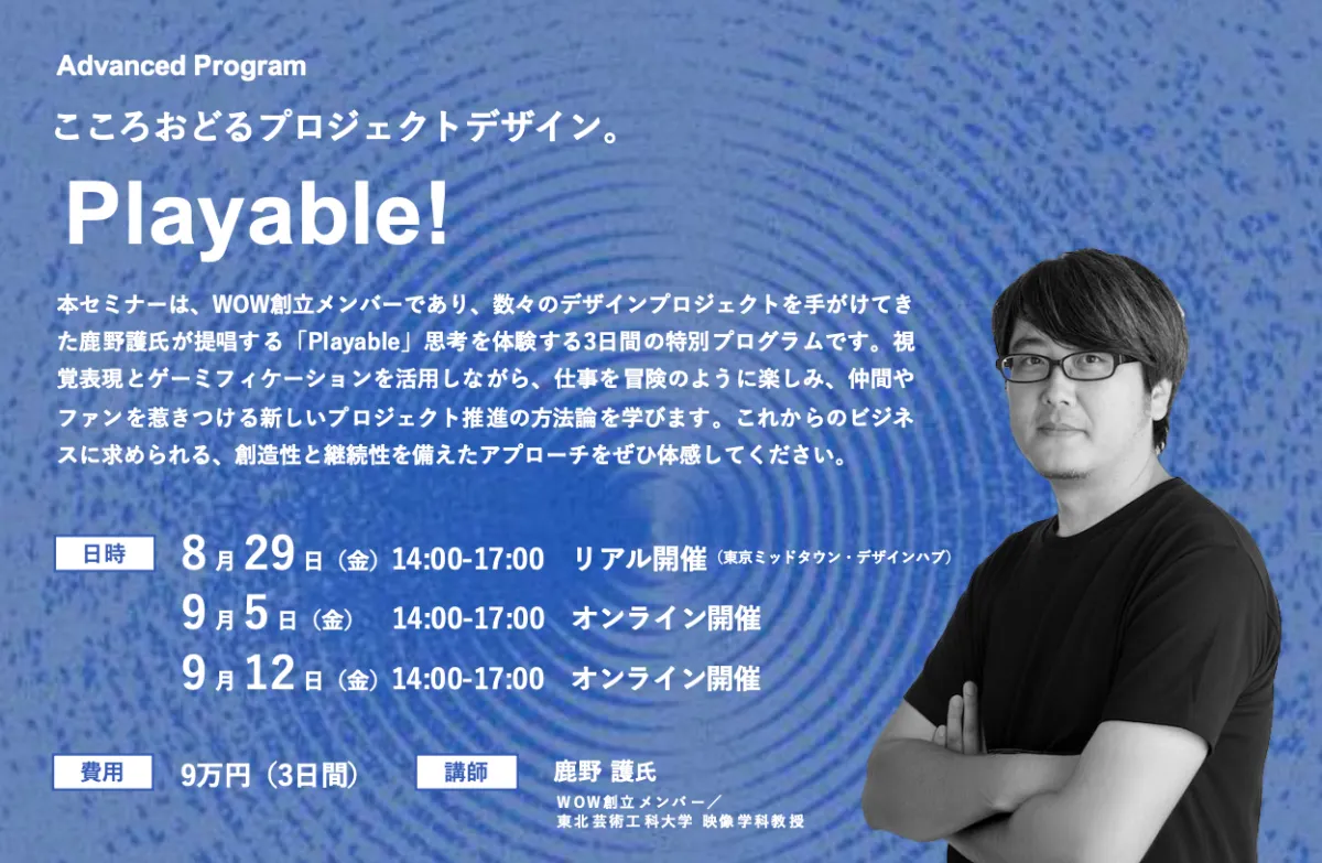 2023年8月29日、東京で特別なセミナーが開催されます。このセミナーでは、なべなべお化けの鹿野護氏が講師を務め、彼が提唱する「Playable」思考について深く学ぶことができます。WOWの創立メンバーである鹿野氏は、映像学科教授としても知られ、これまで数多くのデザインプロジェクトに取り組み、その経験を元に新たなビジネスのあり方を提示してきました。