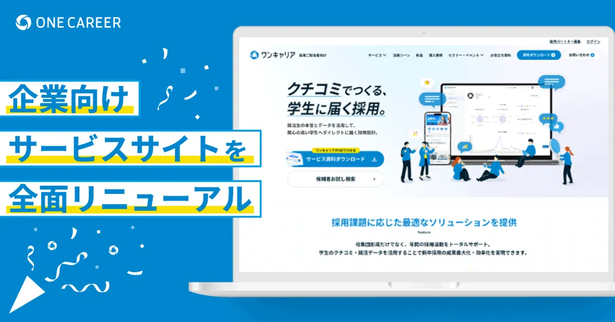 株式会社ワンキャリアは「⼈の数だけ、キャリアをつくる。」というミッションを掲げ、個人や企業が仕事選びに関する多様なデータを利用できるプラットフォームを提供しています。サービスには、学生向けの就活支援、「新卒採用」に特化した企業向けサービス、さらには転職支援サービスも展開しています。このたびのリニューアルを通じて、さらに多くの企業が採用活動を成功させる手助けができることを期待しています。