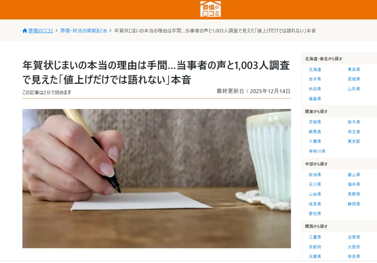 近年、年賀状じまいが増加している背景には、手間や費用の負担が大きく影響しています。株式会社ディライトが発表した調査では、年賀状じまいを選んだ理由として最も多かったのが「手間の軽減」で、なんと43.2%という結果が出ています。実際に年賀状じまいを経験した当事者のインタビューから、彼女たちの本音や心理的な解放感について探っていきます。