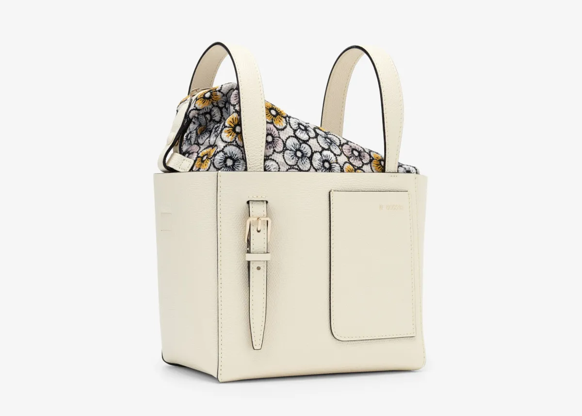 新作として登場した「バケットバッグ マイクロ」、通称「バニーバッグ」はその名の通り、サイジングとデザインにこだわり抜いたプロダクトです。ヤングトレンドの象徴ともいえるこちらのバッグは、ミナ ペルホネンの独自のテキスタイルを用いたポーチをアクセントに添えており、見る者の心をつかむ華やかさがあります。また、このテキスタイルはデザイナー皆川 明氏の手によって、小さな花が太陽を浴びながら風に揺れる美しい姿が刺繍で表現されています。