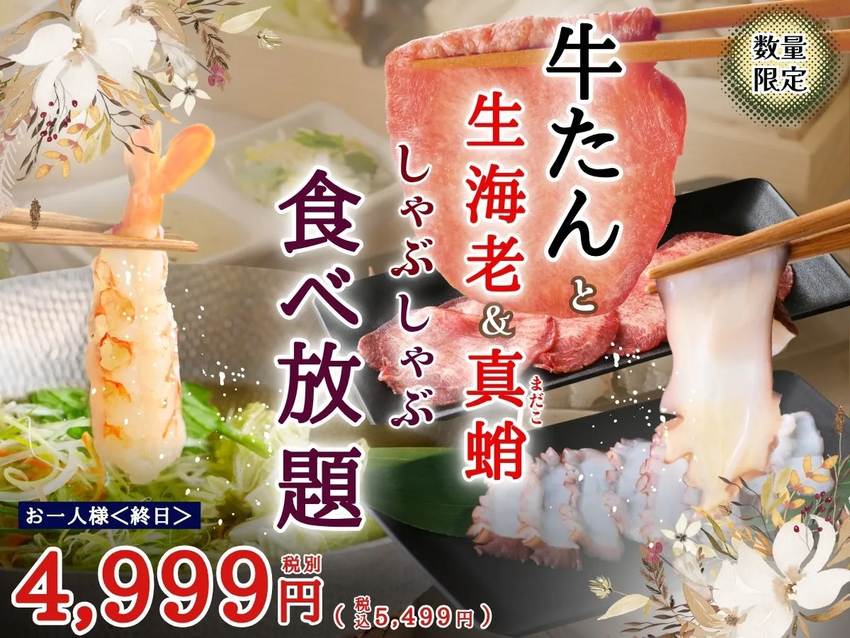 大人数での食べ放題に自信がない方や、軽く試してみたい方には、特別な1皿盛りコースもご用意。お気軽に、特選牛タン、生海老、真蛸の中からお選びいただけます。どちらのコースも、この秋を見逃さない美味しさが詰まっています!