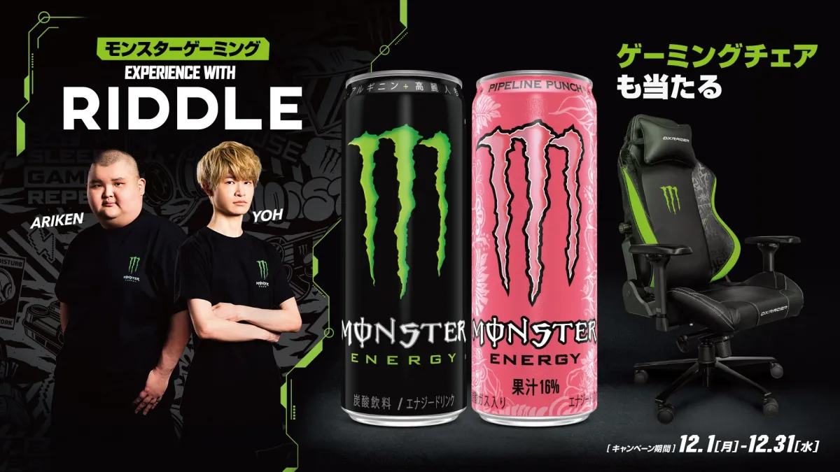 この機会をお見逃しなく!モンスターエナジーを楽しみながら、RIDDLEの人気ストリーマーたちと貴重な体験を共有するチャンスです。キャンペーンの詳細や応募方法はキャンペーンサイトをご確認ください。2024年の年末は、モンスターエナジーを飲んでRIDDLEとともに特別な時間を過ごしましょう!