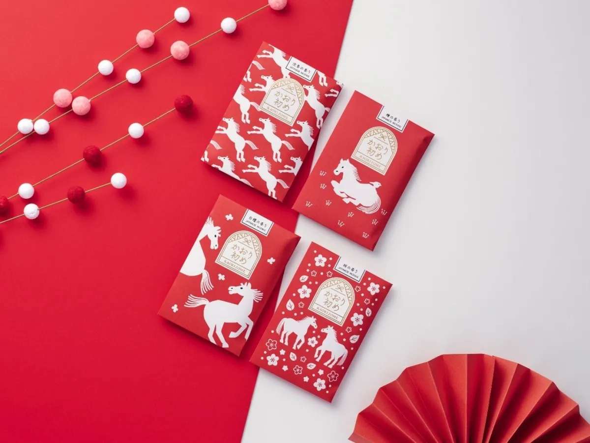 「かおり初め」とは、新年に香りで清められる習慣を指します。このスティックは、沈香、白檀、桜、檜の4種類の香りを楽しめる各種を含み、特別にデザインされた午のイラストとメッセージ付きのパッケージで提供されます。もちろん香立ても付いており、550円(税込)で購入可能で、手軽なお年賀やお土産としてもぴったりです。