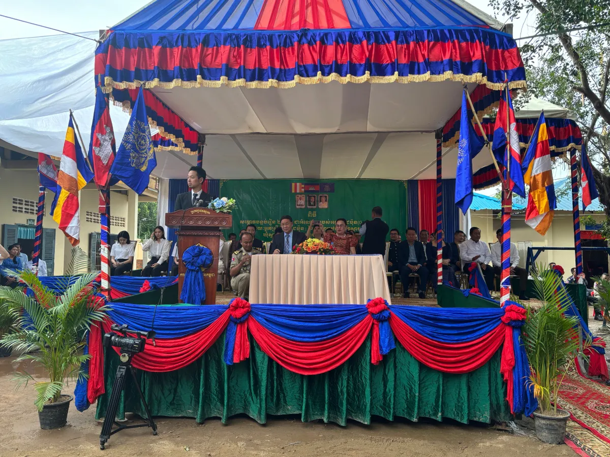 渡航2日目、10月26日は、カンボジア政府の大臣との朝食会から始まりました。この会談では、今後の教育課題や経済発展に関する意見交換が行われ、法人としての役割やさらなる支援の方向性について話し合いました。そして、この日のメインイベントである、スワイドムナック学校での校舎増設記念式典へと向かいました。この学校は、ゼネラルリンクが支援を行い公立化を達成したもので、多くの子どもたちや支援関係者の前で新しい校舎の完成を祝いました。多くの子どもたちが教育を受けられる環境が整ったことに、私たちの支援活動の意義を実感しました。