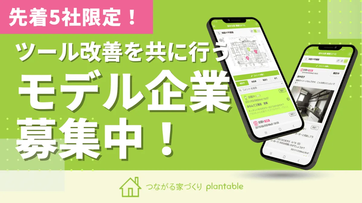 工務店の皆様に朗報です!株式会社エフ・ディー・シーは、工務店向けコミュニケーションアプリ「つながる家づくり plantable」の全機能を、先着5社に限り1年間無料で提供するモデル企業を募集中です。