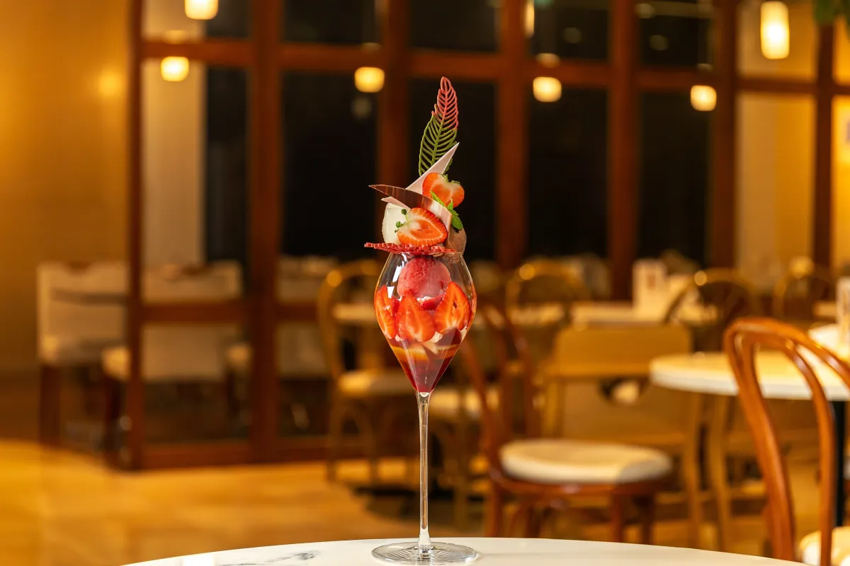 また、スパークリングワインとのペアリングが楽しめるオプションもあります。いちごと洋梨の風味を活かしたスパークリングワインが、パフェとの相性を引き立て、まさに見た目にも味わいにも贅沢な組み合わせです。