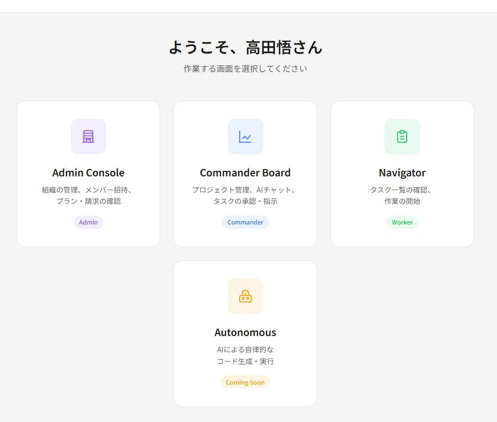 「Navi」は、個別の力に頼るのではなく、チーム全体での利用を促進します。役割を分担(Admin、Commander、Worker)し、効率的にプロジェクトを進めることができる体制を整えています。