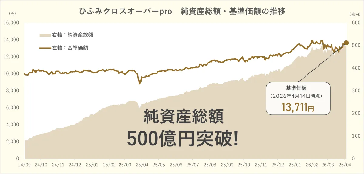 「ひふみクロスオーバーpro」は、投資信託「ひふみ」シリーズを運用するレオス・キャピタルワークス株式会社が手掛けています。本ファンドは2024年9月に運用を開始し、今年の4月8日には純資産総額が500億円に達しました。この数値は、日本国内のクロスオーバー投資を行う投資信託の中でも最大規模となります。