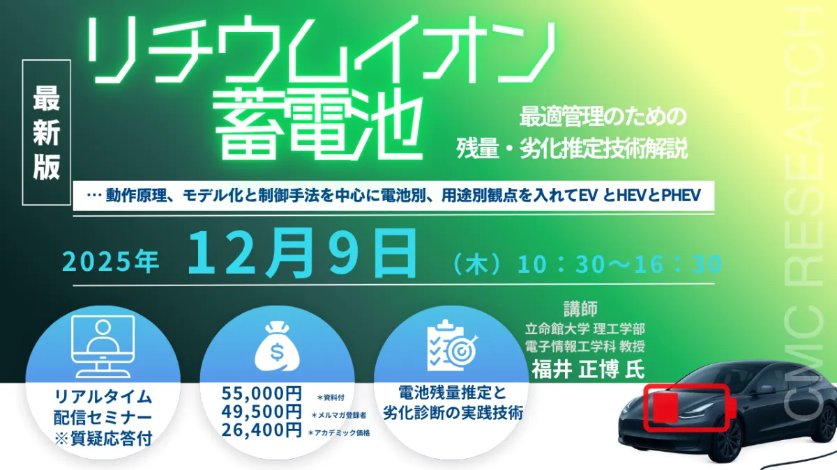 2025年の12月9日(火)、シーエムシー・リサーチが主催するライブ配信セミナー「リチウムイオン蓄電池最適管理のための残量・劣化推定技術解説」が開催されます。リチウムイオン電池技術に興味がある方は必見です!