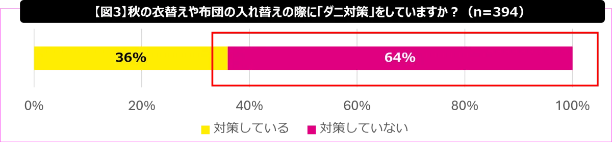 調査によれば、61%の人が秋の不調がダニの影響であると認識している一方で、秋にダニ対策をしているのは20%にとどまっています。つまり、多くの人が秋の衣替えや布団の入れ替え時に無防備でいることを示しています。また、実施しているダニ対策の半数は春や夏で終わらせてしまい、秋冬の対策を軽視していることが明らかとなりました。