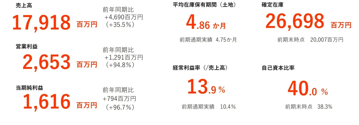 さらに、今期の業績予想が2回目の上方修正を受け、営業利益は期初予想を25.4億円から29.5億円に引き上げました。これは、主に住宅用不動産の販売が好調であったことと、インサイドセールスの強化による営業効率の向上が影響しています。これらの要因により、計画以上の成果が期待されており、業績達成の確度も高まる見込みです。