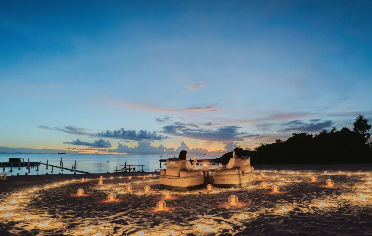 プールエリアからビーチに続く小道には、ガジュマルの木が並び、1万球以上のLEDによる幻想的なシャンパンゴールドのイルミネーションが施されています。また、この小道ではファイヤーピットでの焚火体験も行われ、焼きたてのスモアの香ばしい香りが漂います。大人も子供も共に楽しむことができる、ゆったりとした空間が待っています。