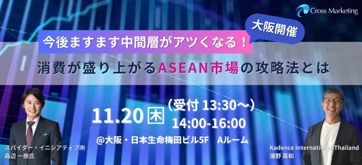 クロス・マーケティングは、参加者がマーケティング戦略を強化できるよう様々なリサーチ手法を用いてサポートしていきます。ASEAN市場での成功を目指す企業にとって、見逃せないセミナーとなるでしょう。