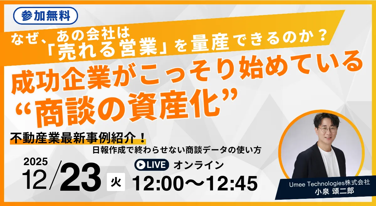 不動産業界において、営業職やマネージャーに必見の無料オンラインセミナーが開催されます。Umee Technologies株式会社が提供するこのセミナーは、「なぜ、あの会社は『売れる営業』を量産できるのか?」をテーマに、商談データの資産化がいかに成約率向上につながるかを解説します。