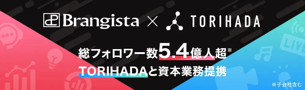 TORIHADAは、TikTokを中心にした動画マーケティングに特化しており、およそ9,000組のKOLやインフルエンサーが所属しています。加えて、100%子会社の「PPP STUDIO」は、総フォロワー数が5.4億人を超える、国内でも最大級の縦型動画クリエイターエージェントです。is使うブランジスタグループの顧客企業は、この強力なネットワークを通じて、商品のプロモーションを迅速かつ効果的に行えるようになります。