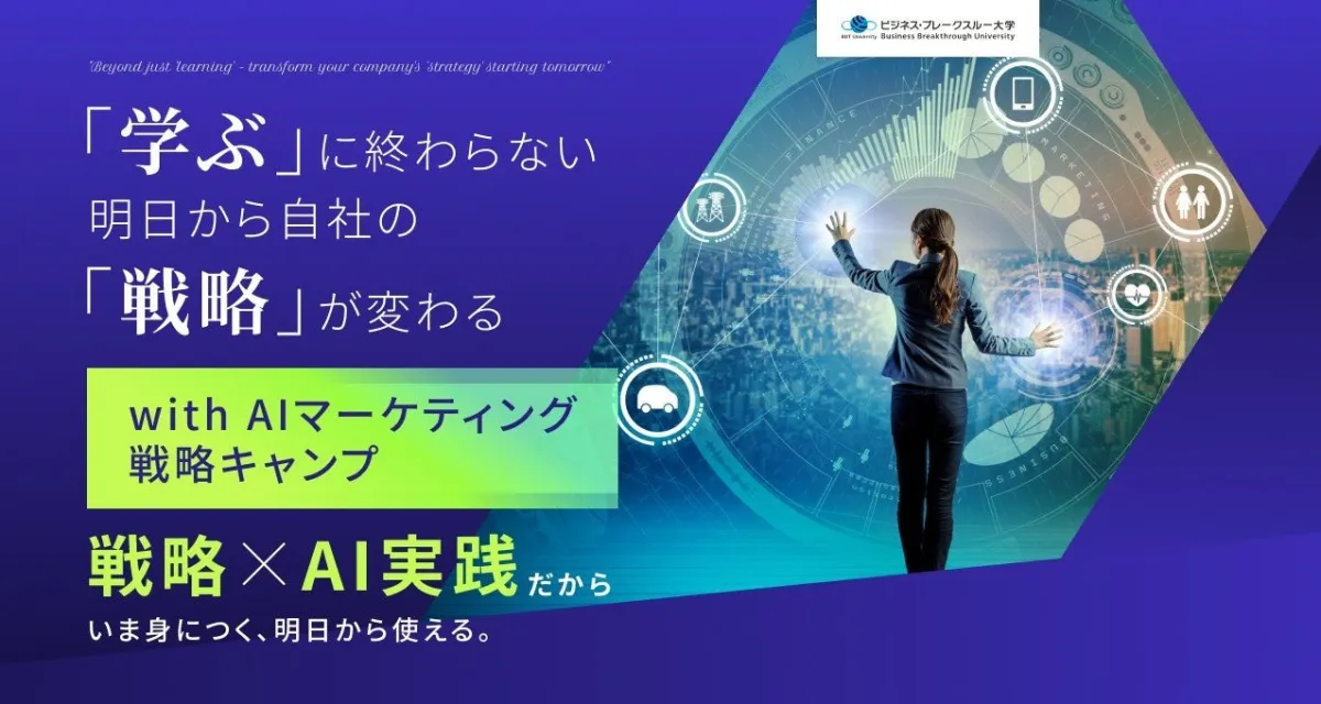 Aoba-BBTが運営するビジネス・ブレークスルー大学では、2023年より「次世代マーケター育成プログラム with AI マーケティング戦略キャンプ」が新たにスタートします。このプログラムは、厚生労働省が提供する特定一般教育訓練給付金の対象講座に認定されており、受講料の50%(上限あり)が給付されるため、さらなる学びを求めるビジネスパーソンにとって大変魅力的な機会となります。