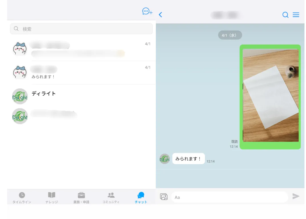 - - 連絡のスムーズさ:前日同じ現場の先輩に確認を取りたい時、電話による連絡は相手の都合でつながらないこともありました。しかし、チャット機能によって、自分の都合に合わせたタイミングで連絡ができるようになりました。