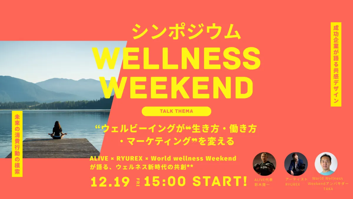 シンポジウムのテーマは、“ウェルビーイングが❝生き方・働き方・マーケティング❞を変える”。このテーマを基に、ALIVE、RYUREX、World Wellness Weekendの代表者が語りかける新しいウェルネスの時代の形成と共創について掘り下げていきます。