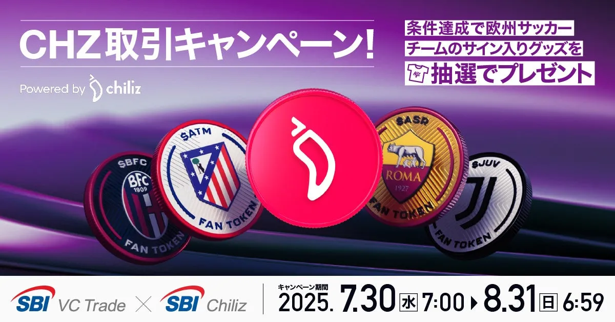 この夏、SBIホールディングスの傘下であるSBI VCトレード株式会社とSBI Chiliz株式会社のコラボレーションによる注目のキャンペーンが始まります。キャンペーン名は「【SBI VCトレード×SBI Chiliz】CHZ取引キャンペーン!」。2025年7月30日から2025年8月31日までの期間中、CHZを1万円以上購入した方を対象に、抽選で豪華なサッカーグッズをプレゼントします。