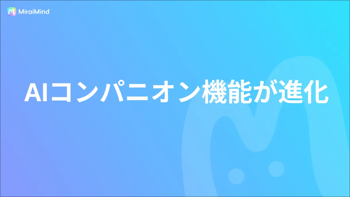 MiraiMindのAIコンパニオンは、単に話しかける存在から、共に過ごし、心に寄り添う存在へと進化しています。日常の中に「もう一人」のパートナーを迎え入れることで、あなたの生活が少し優しく、温かいものになるでしょう。それが、MiraiMindの目指す未来です。