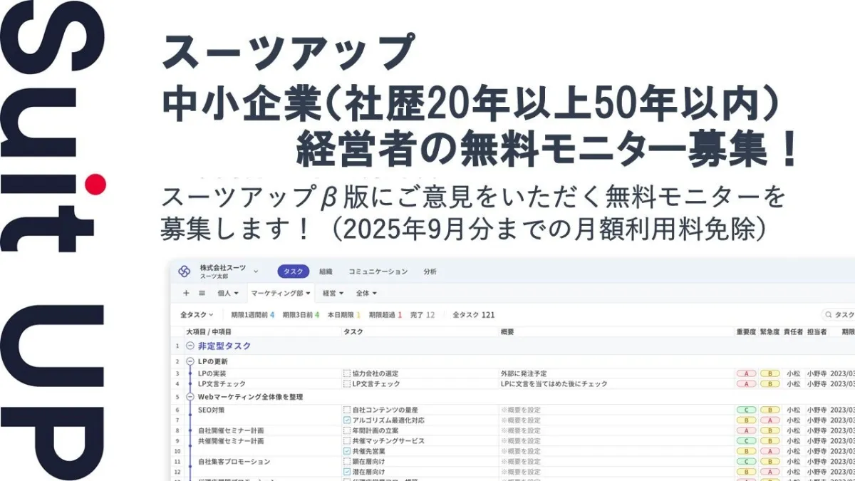 株式会社スーツは、経営者が多忙な中小企業(社歴20年以上50年以内)のために、チームのタスク管理をスマートに行えるツール「スーツアップ」の無料モニターを募集しています。これを機に、業務の効率化を図りましょう!