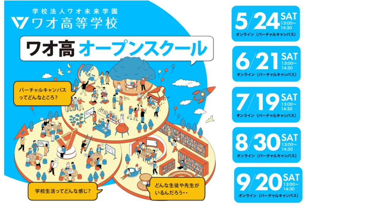 岡山県岡山市にある学校法人ワオ未来学園のワオ高等学校では、10月から12月にかけて『ワオ高オープンスクール』をオンラインで開催します。対象は中学生や高校生、保護者の方々で、ワオ高校のユニークな教育スタイルを体験できる貴重な機会です。
