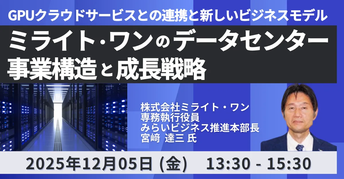 2025年12月5日(金)、日本計画研究所は、株式会社ミライト・ワンの宮崎達三氏を講師に迎え、データセンター事業の成長戦略に関するセミナーを開催します。このセミナーでは、生成AIやデジタルイノベーションの急速な進展により、国内外で高まっているデータセンターの需要について詳しく述べます。