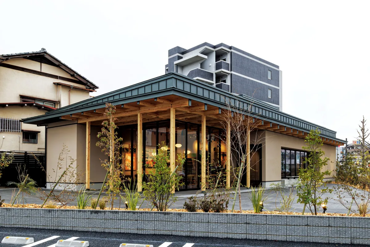 この建物は、従来の工法に比べて非常に高い耐震性能を有したLC-core構法を取り入れており、CLTパネルを効果的に使用することで、広々とした空間を実現しています。特に印象的なのはL字型コーナー部に設けられた大開口サッシです。これにより、店内と外部の境界が明確でなくなり、自然との一体感を演出しています。