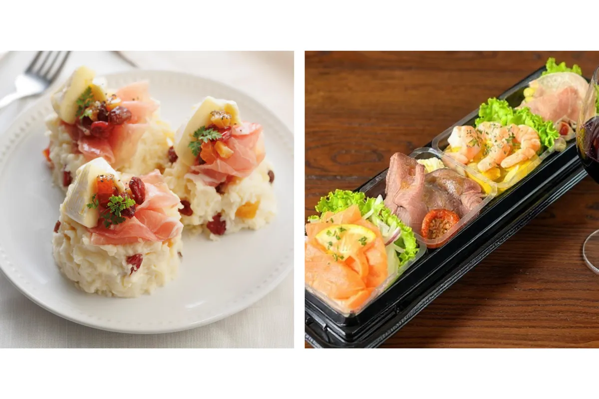 まずご紹介するのは「カマンベールと生ハムのポテトサラダ~ドライフルーツ入り~」。この商品は、昨年人気だった「カマンベールチーズと生ハムのポテトサラダ~ナッツ添え~」を進化させた新しい一品です。北海道産のさやかを使用した滑らかなポテトサラダに、クリーミーなカマンベールと程良い塩味の生ハムを贅沢にトッピング。さらに、今年はドライフルーツとはちみつの甘味を加え、ワインのフルーティーさを引き立てる上品な味わいに仕上げています。関西の店舗ではアーモンドをトッピングしており、さらに香ばしさと食感が楽しめる耳寄りなポイントです。