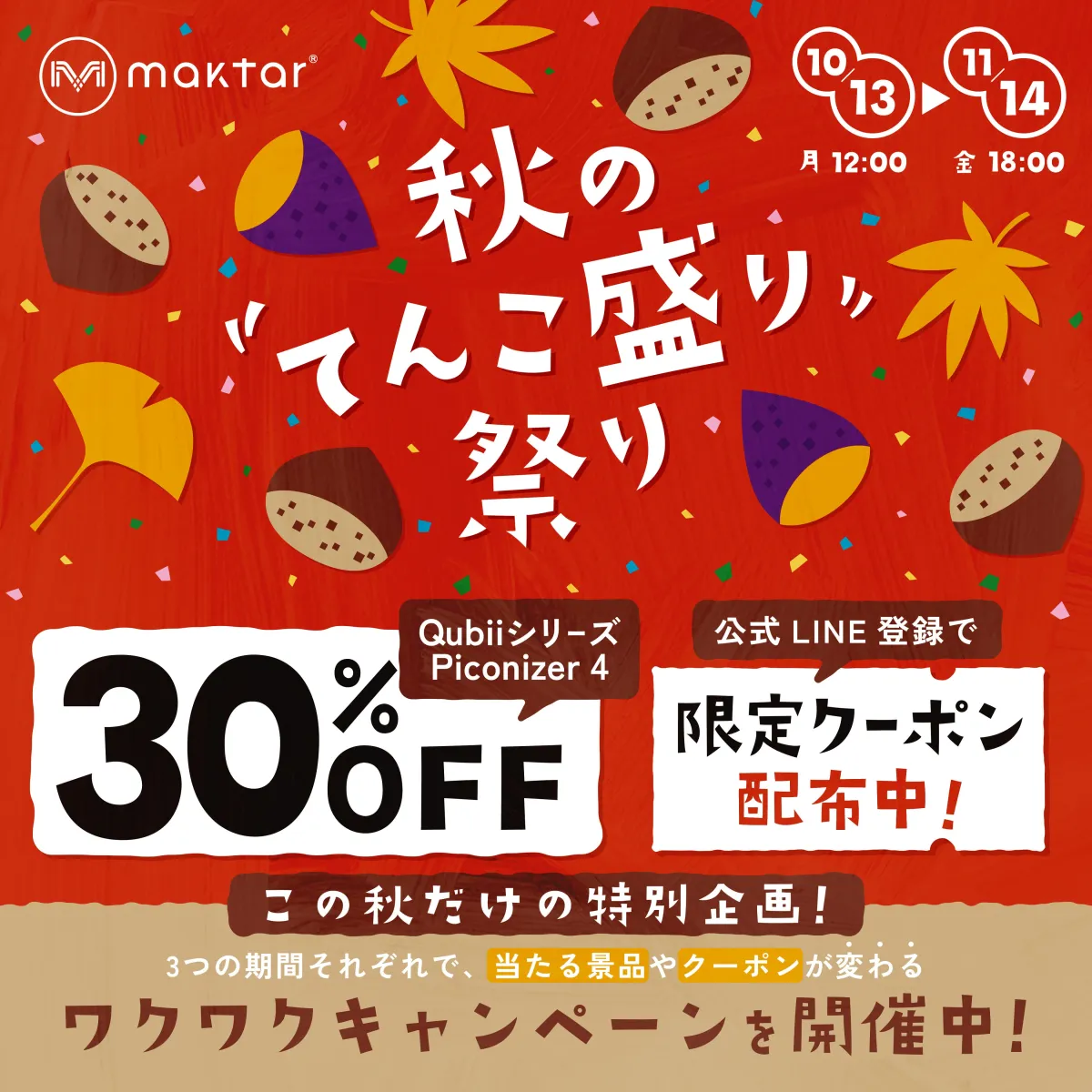 Maktar株式会社の公式オンラインショップで、今年の「秋のてんこもり祭り」がスタートしました。期間は10月13日(月)から11月14日(金)までの約一ヶ月間。これに伴い、お得なセールや楽しい企画が盛りだくさんで、今年の秋をより充実させるチャンスが到来です。