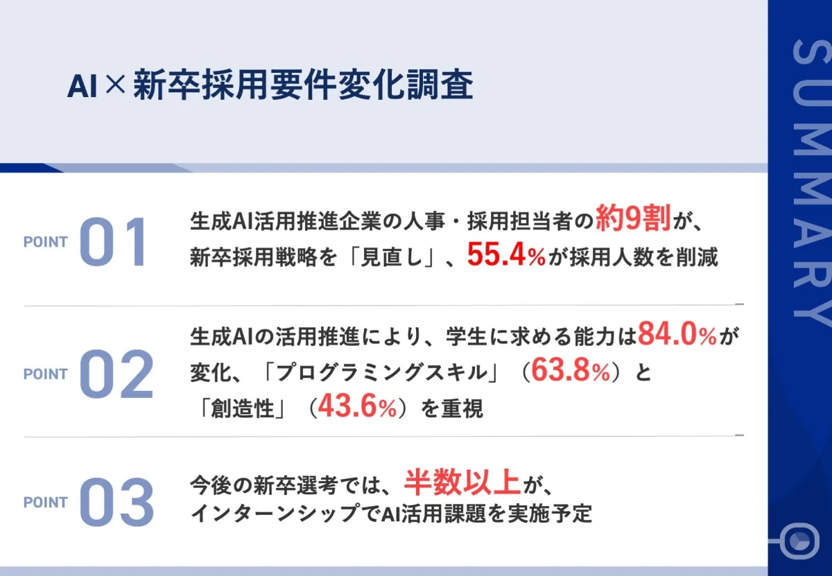 今回の調査を通じて、生成AI技術が新卒採用に与える影響を見極めることができました。企業はただ単に人員を削減するのではなく、AIと共に創造的に働く人材を求めているため、学生側も新たな技術を学び、適応力を高める必要があります。今後、企業と学生がどのように新たな価値を創出していくかが、日本の未来を左右する重要な鍵になるでしょう。