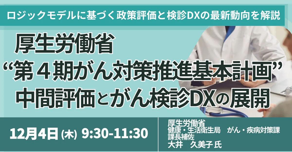 2025年12月4日(木)、日本計画研究所(JPI)が主催するセミナーが開催されます。このセミナーでは、厚生労働省健康・生活衛生局のがん・疾病対策課の課長補佐である大井久美子氏が講師を務め、「第4期がん対策推進基本計画」の中間評価と、がん検診のデジタル化について解説します。